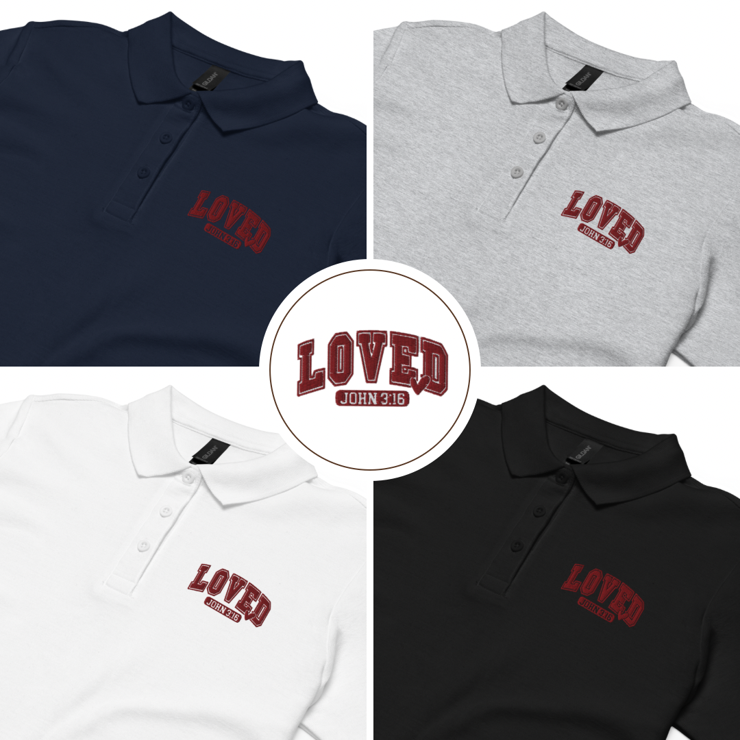 Edles gesticktes Design in wunderschöner College Schrift "LOVED John 3:16" direkt über dem Herzen erinnert dich und andere daran, dass wir in unendlich geliebt sind - von Jesus Christus.
